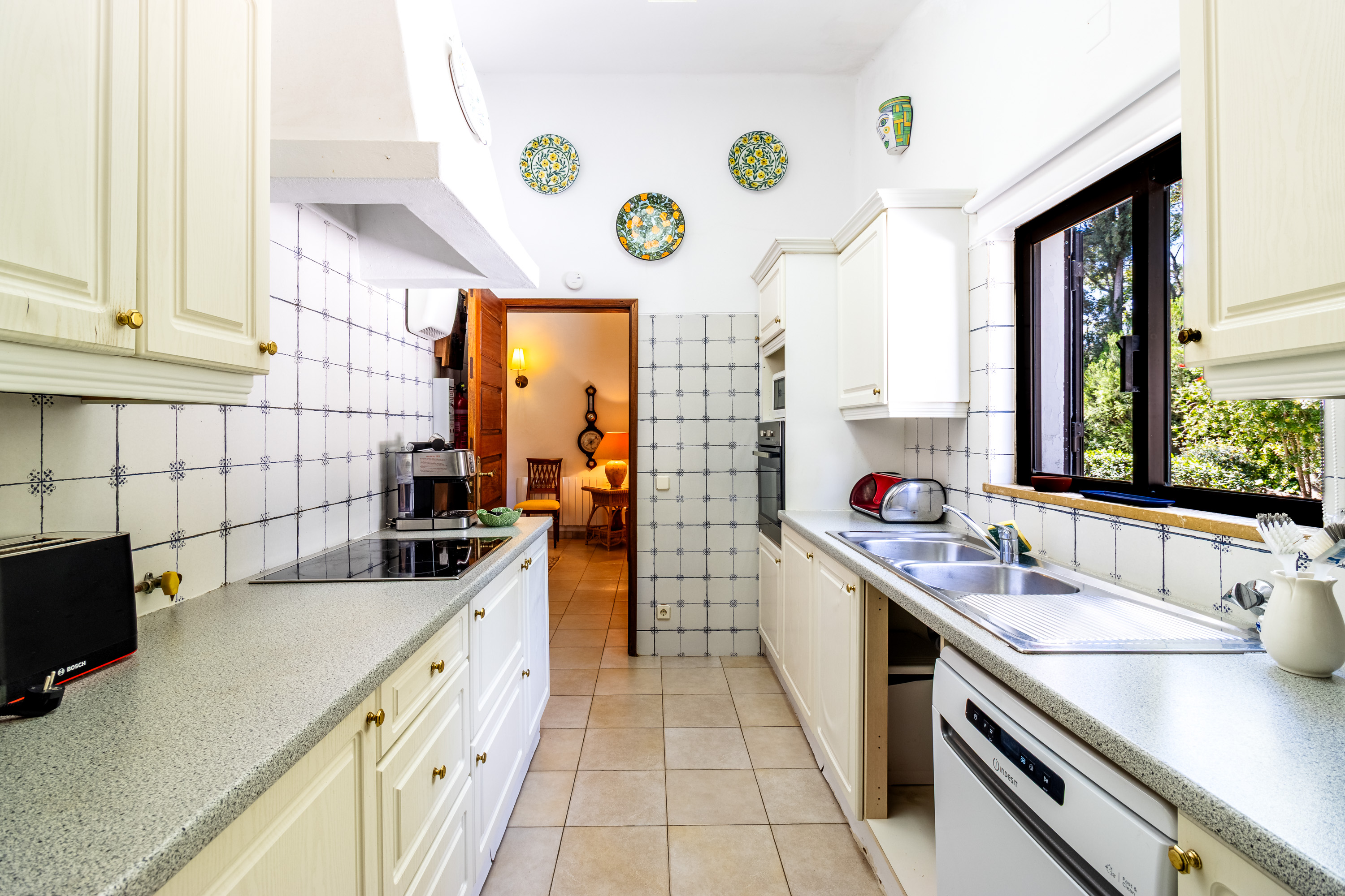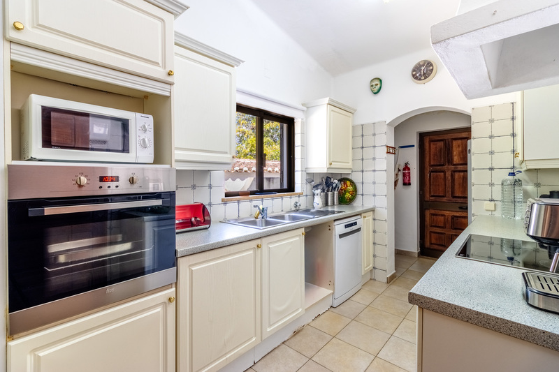 Moving back towards the entrance, there is a traditional style kitchen with extra space that could be used as a pantry. The kitchen also offers excellent potential to be opened up into the dining area, creating a more contemporary open plan layout while still retaining the charm and character of the property. A door from the kitchen leads out to a practical outdoor space, ideal for drying clothes in the Algarve sunshine.