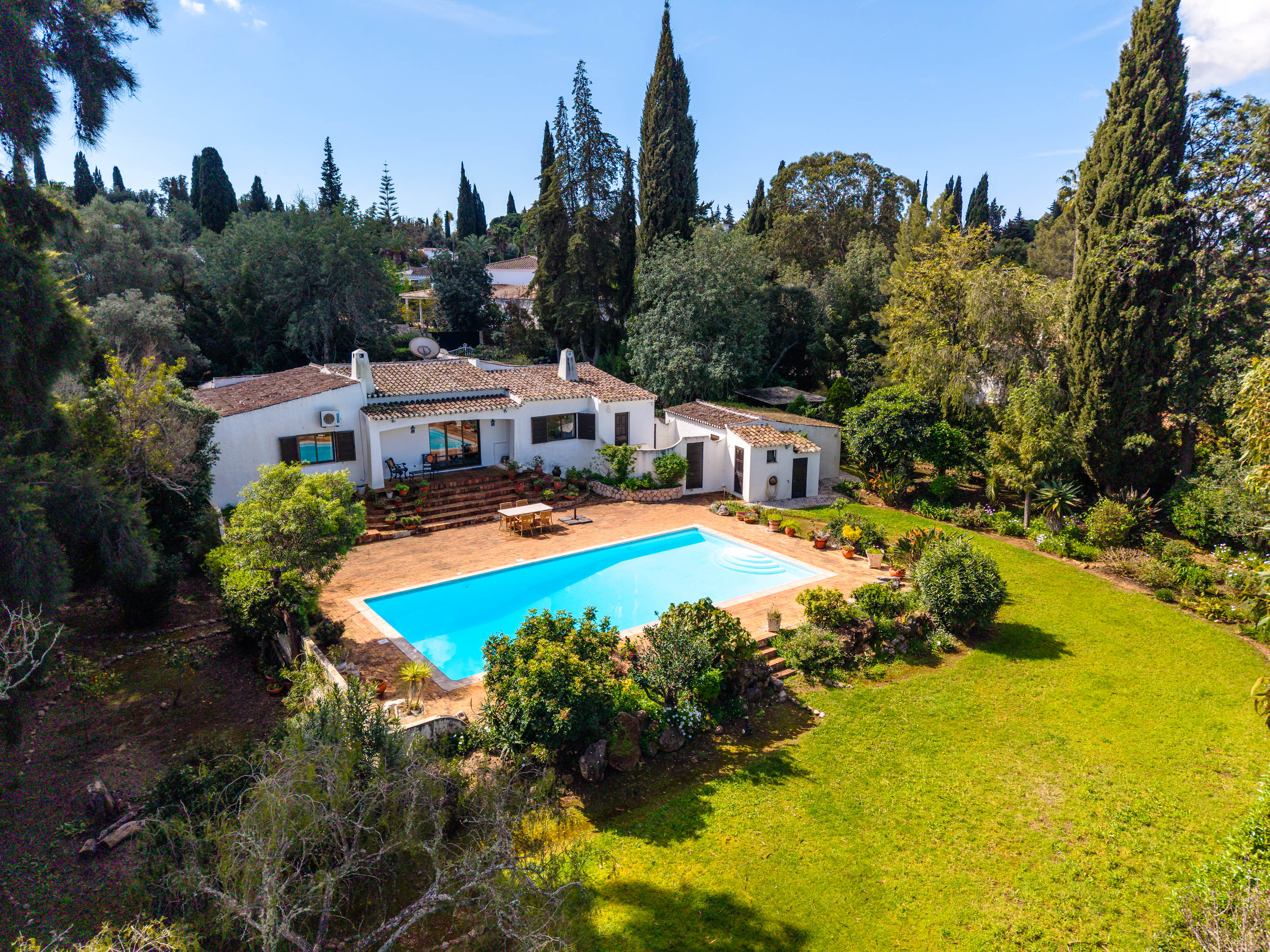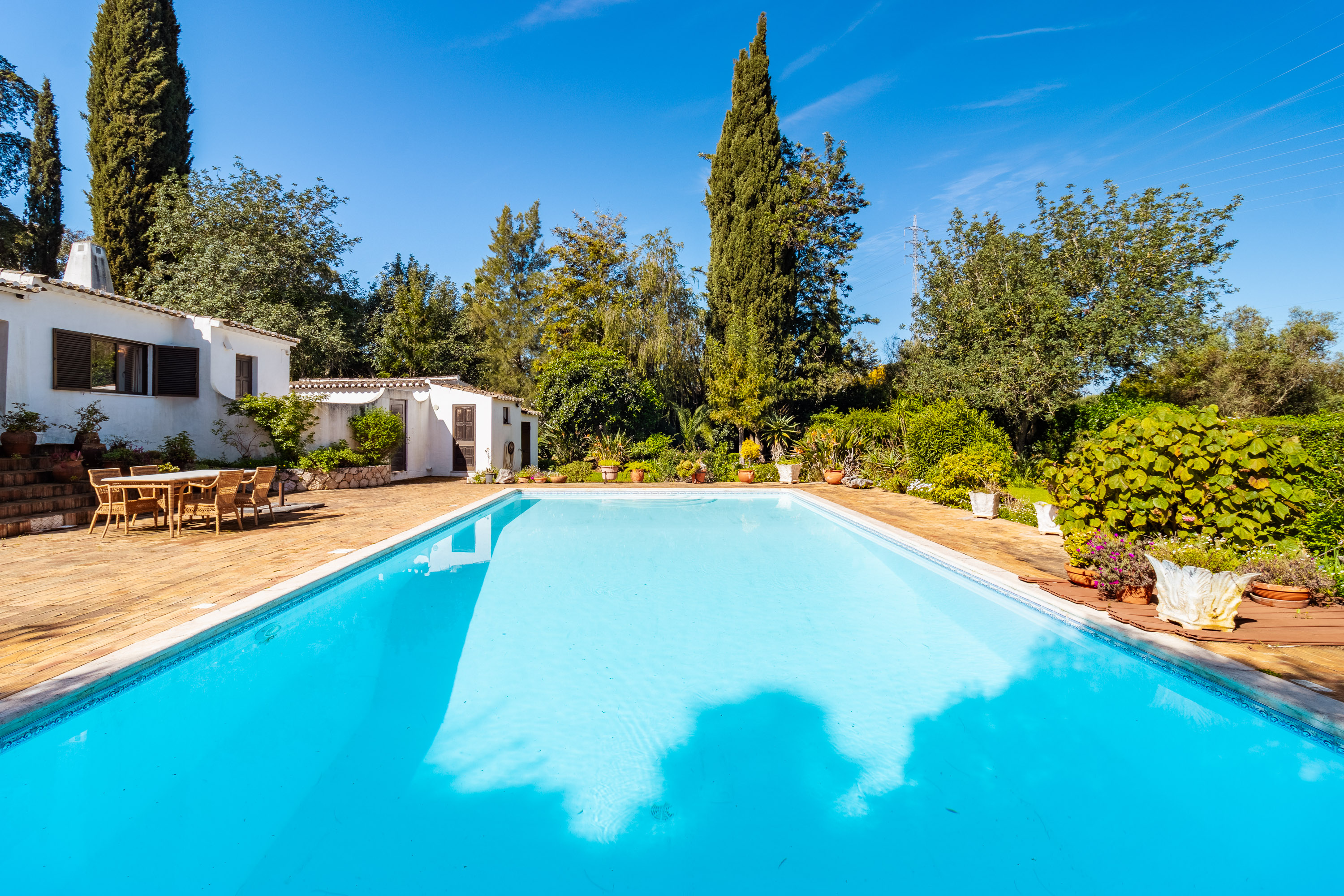 The setting is incredibly peaceful, with the gentle sound of birdsong creating a truly relaxing environment. Outside, at the rear of the property, is a beautiful mature garden with many potted plants, bird of paradise and a lovely lawned area. The 10x4m swimming pool is perfectly positioned directly in front of the villa, and is surrounded by a large terrace – the perfect place to entertain, or relax in the sun surrounded by nature.