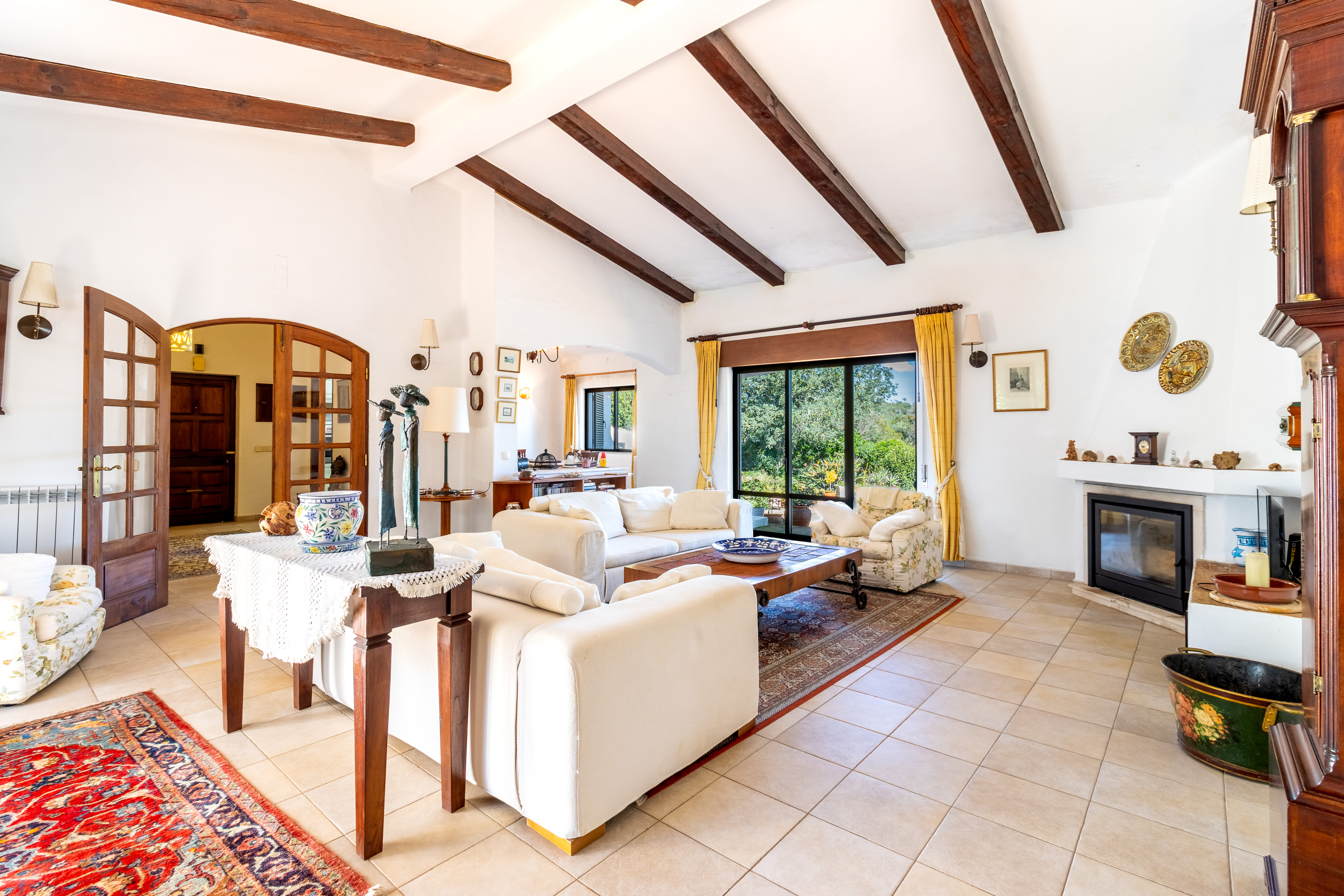 As you step inside, you are welcomed by an impressive high ceiling hallway that immediately creates a feeling of space, light and elegance. From there, glass doors open into a large open plan living and dining area where sliding doors on both sides of the room flood the space with natural light, creating a bright, and inviting living space. Feature wooden beams and a wood burning fireplace add charm and character, while also creating a wonderful atmosphere for cosy winter evenings and relaxed entertaining.