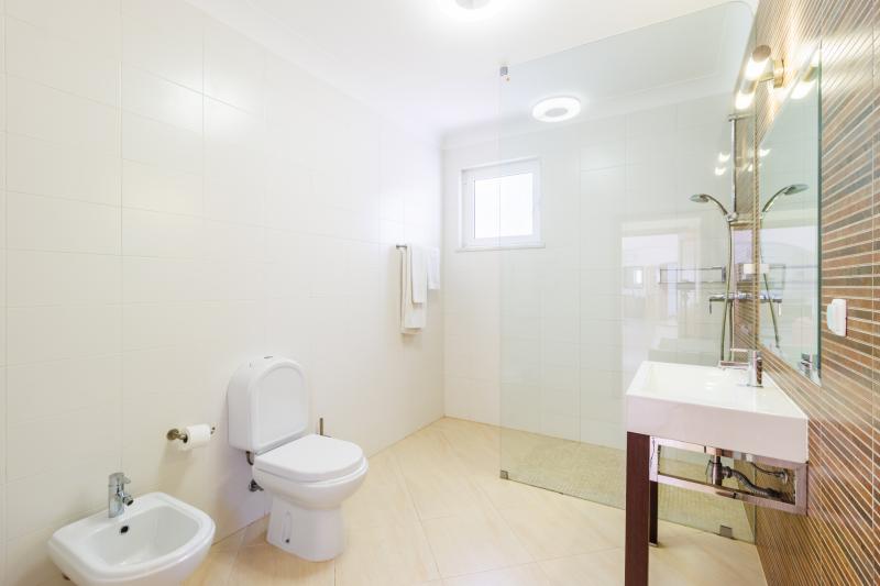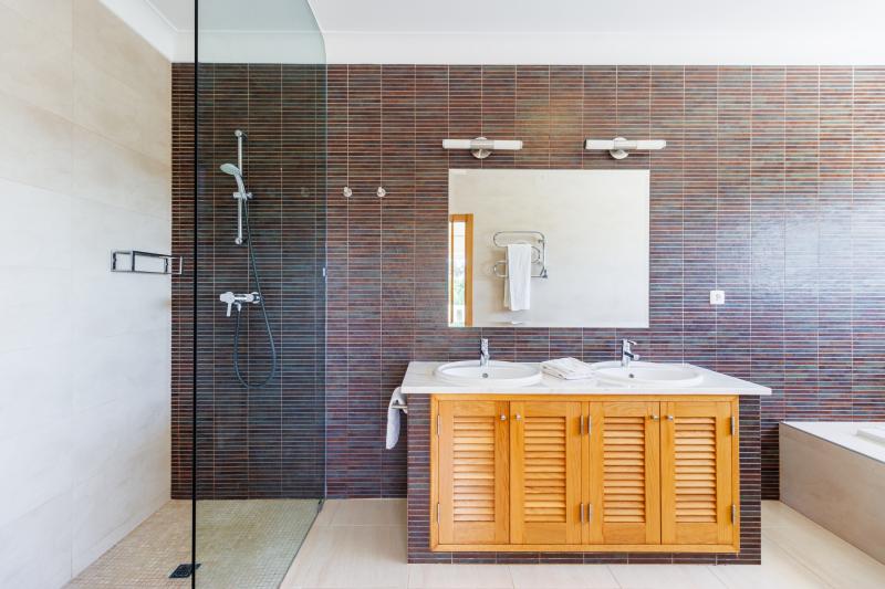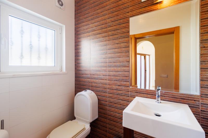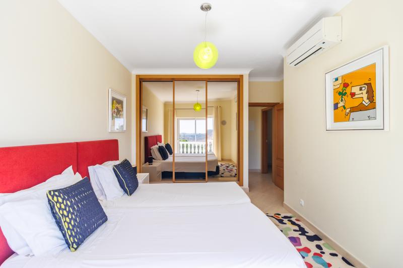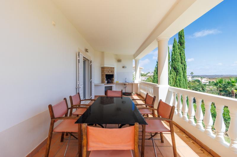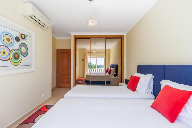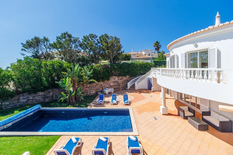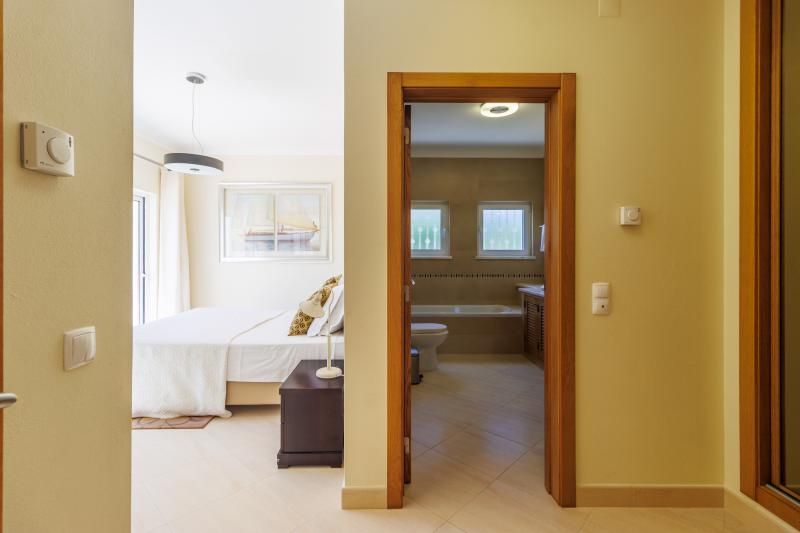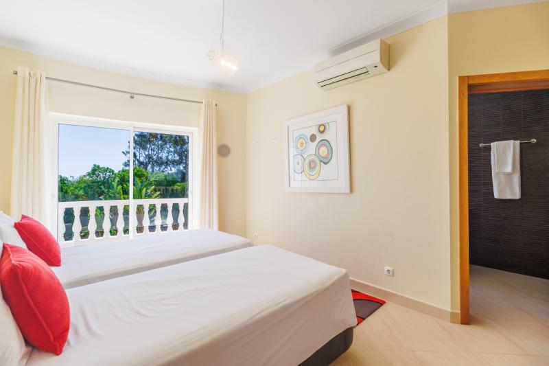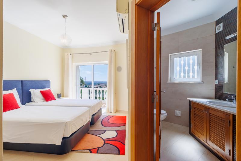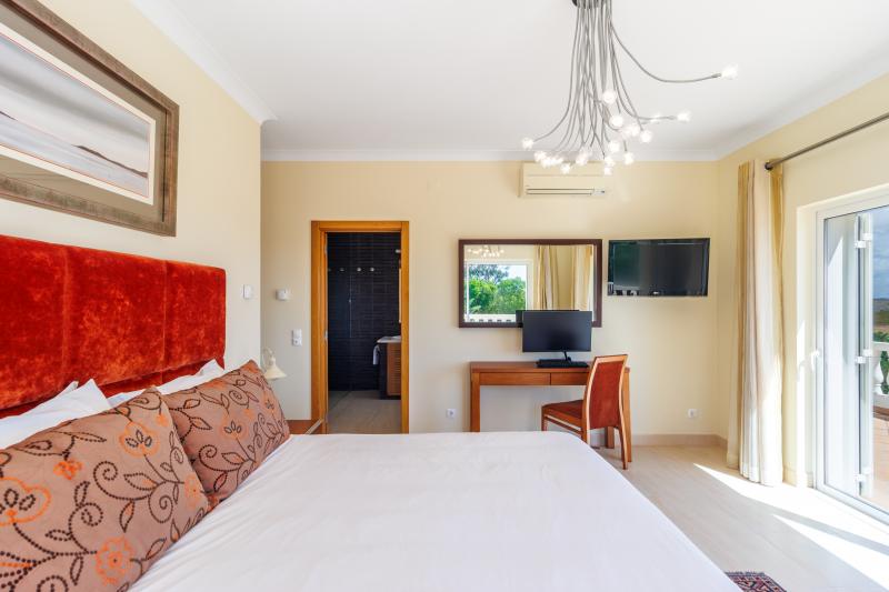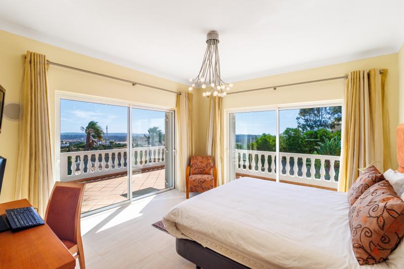Upstairs, four generous en-suite bedrooms await. The master suite includes a walk-in wardrobe, a luxurious bathroom with shower and bathtub, and a large picture window with views stretching to Monchique, plus a private balcony for peaceful mornings. The remaining bedrooms share a balcony with steps leading down to the pool.