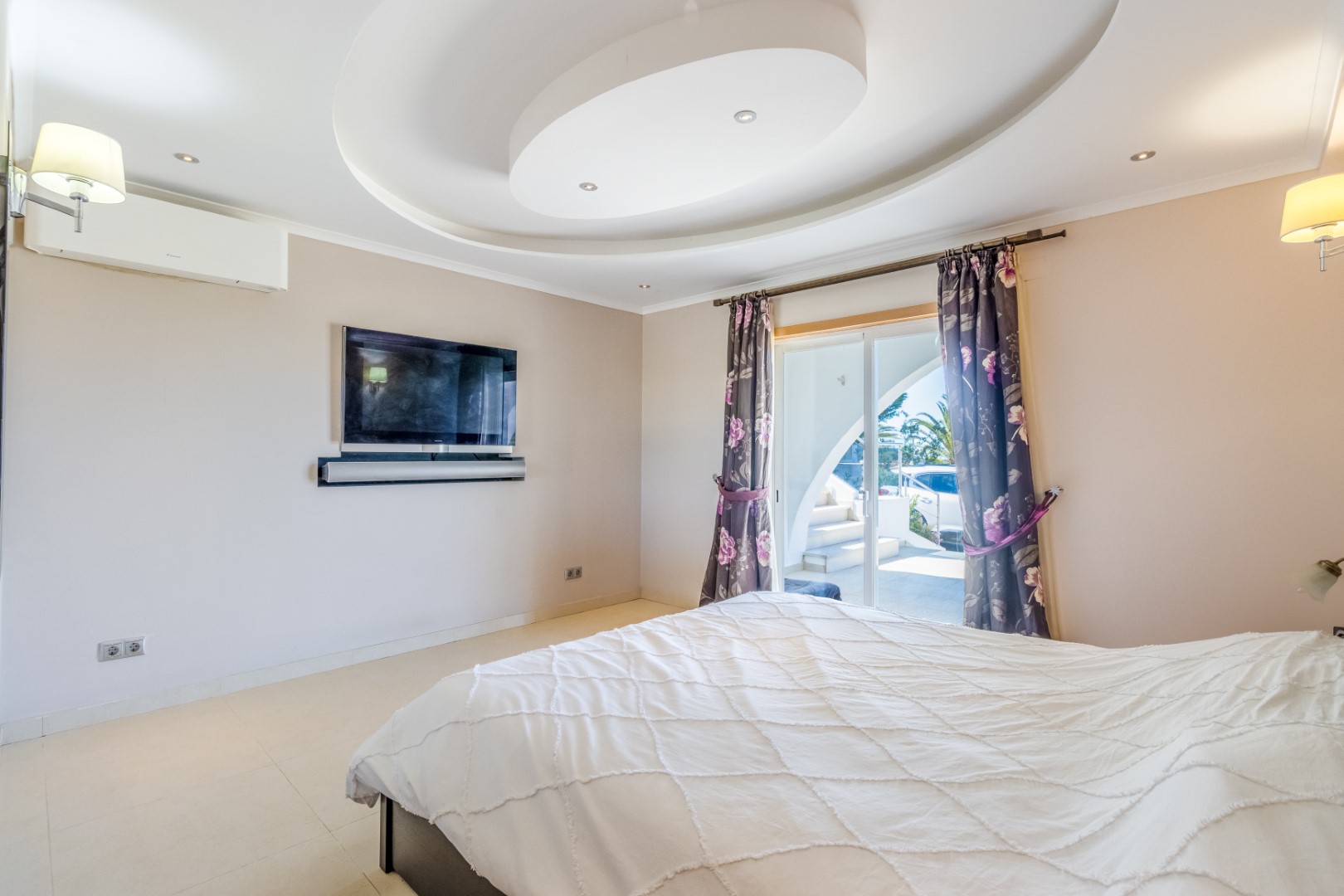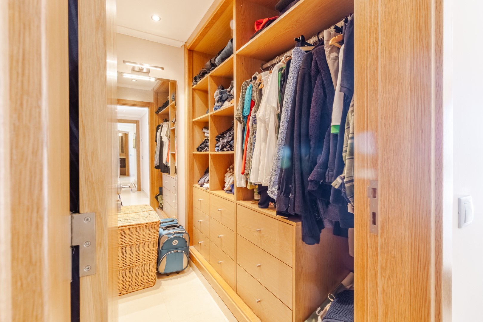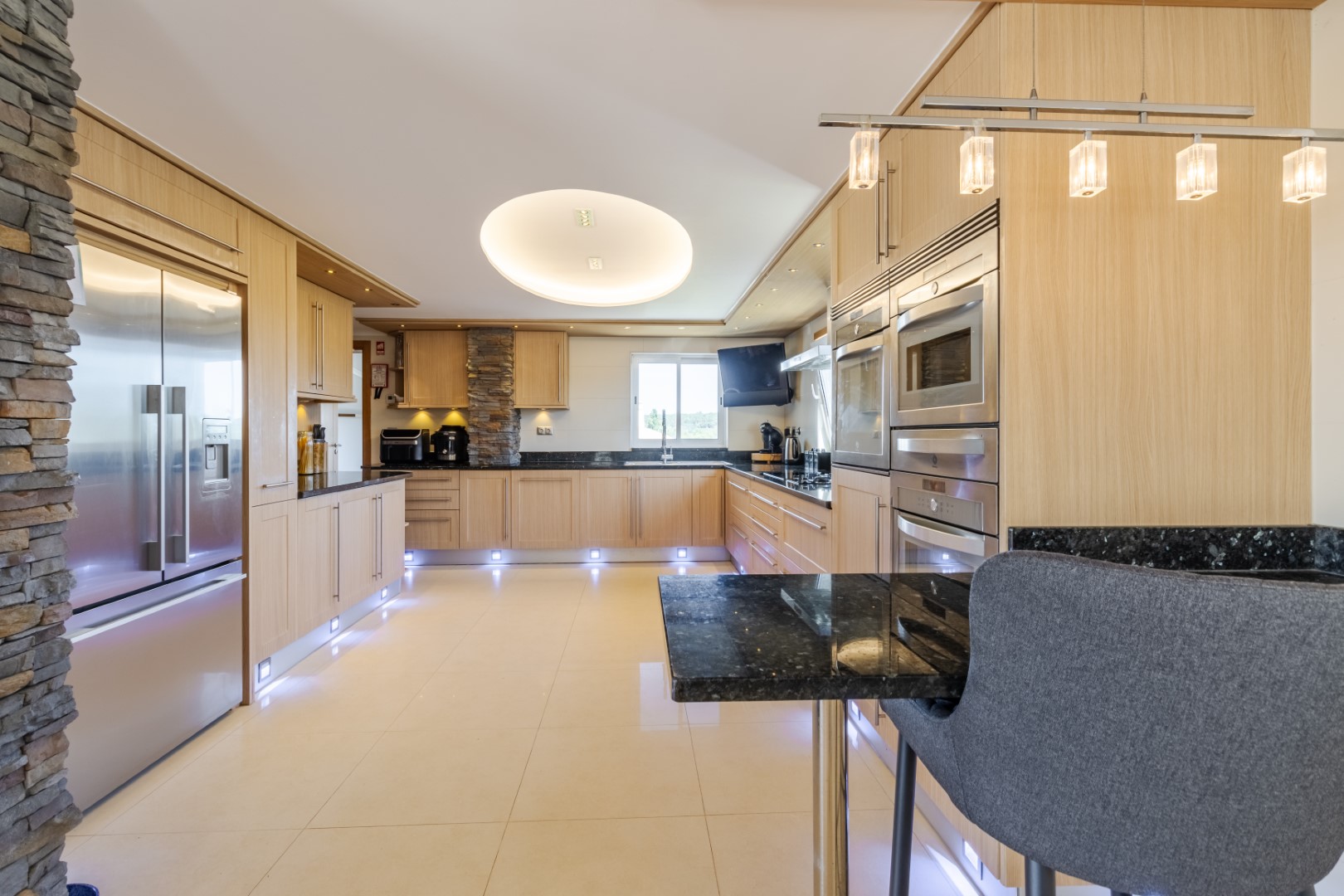 The open plan living and dining room is the perfect place for entertaining. Doors lead to a spacious terrace which overlooks the pool, and has an electric awning for shade. The large kitchen is fully equipped, and flows seamlessly from the dining area. There is also a guest toilet, and utility area on this level, which can also be used as an office.
