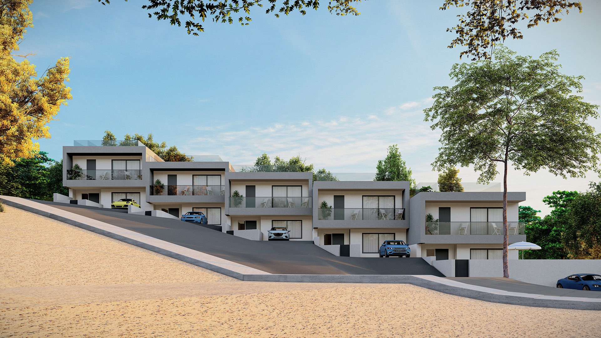 This exclusive development of only four modern T3 terraced villas is arranged over two floors plus a basement, each benefiting from two private parking spaces within a 20 m² garage.