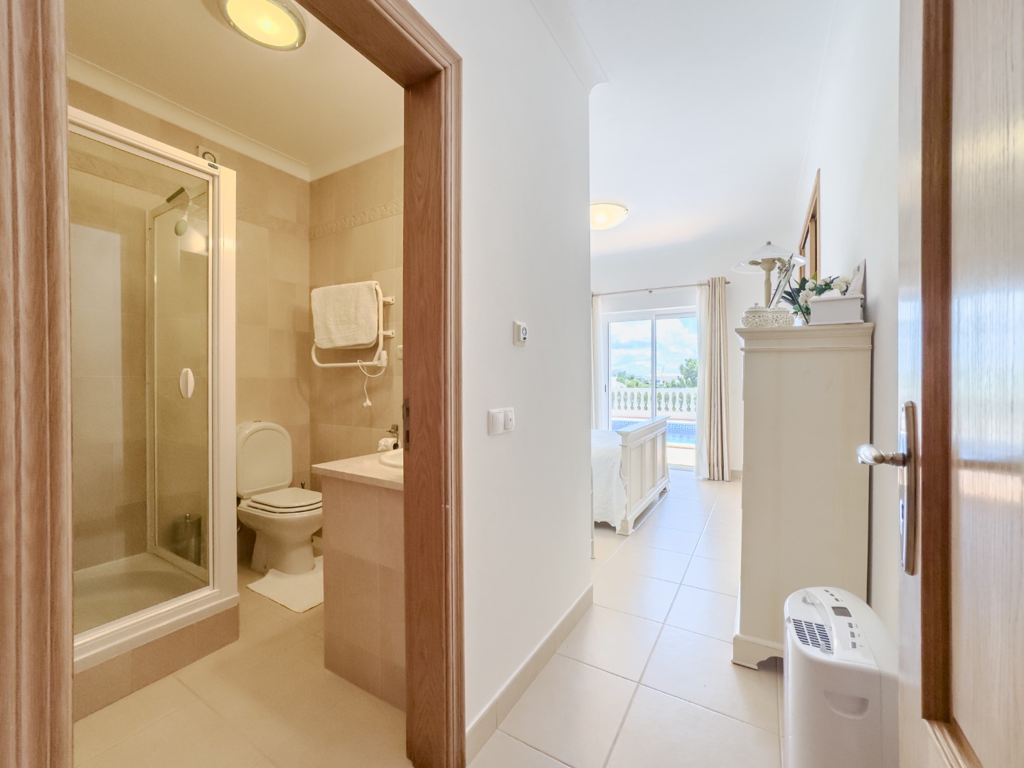 Downstairs, there are 3 generously sized double bedrooms, each with en-suite bathrooms and fitted wardrobes. These bedrooms open directly onto the inviting pool terrace, which can also be accessed from the upper level.