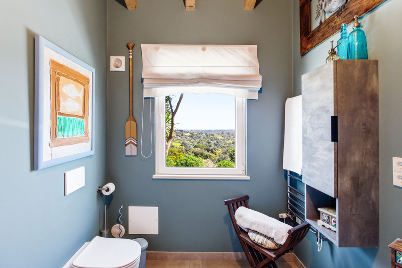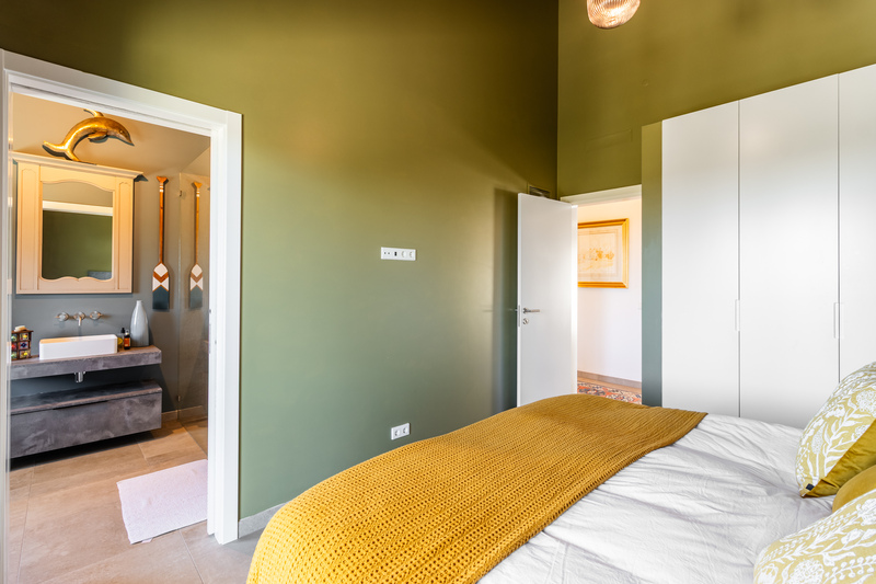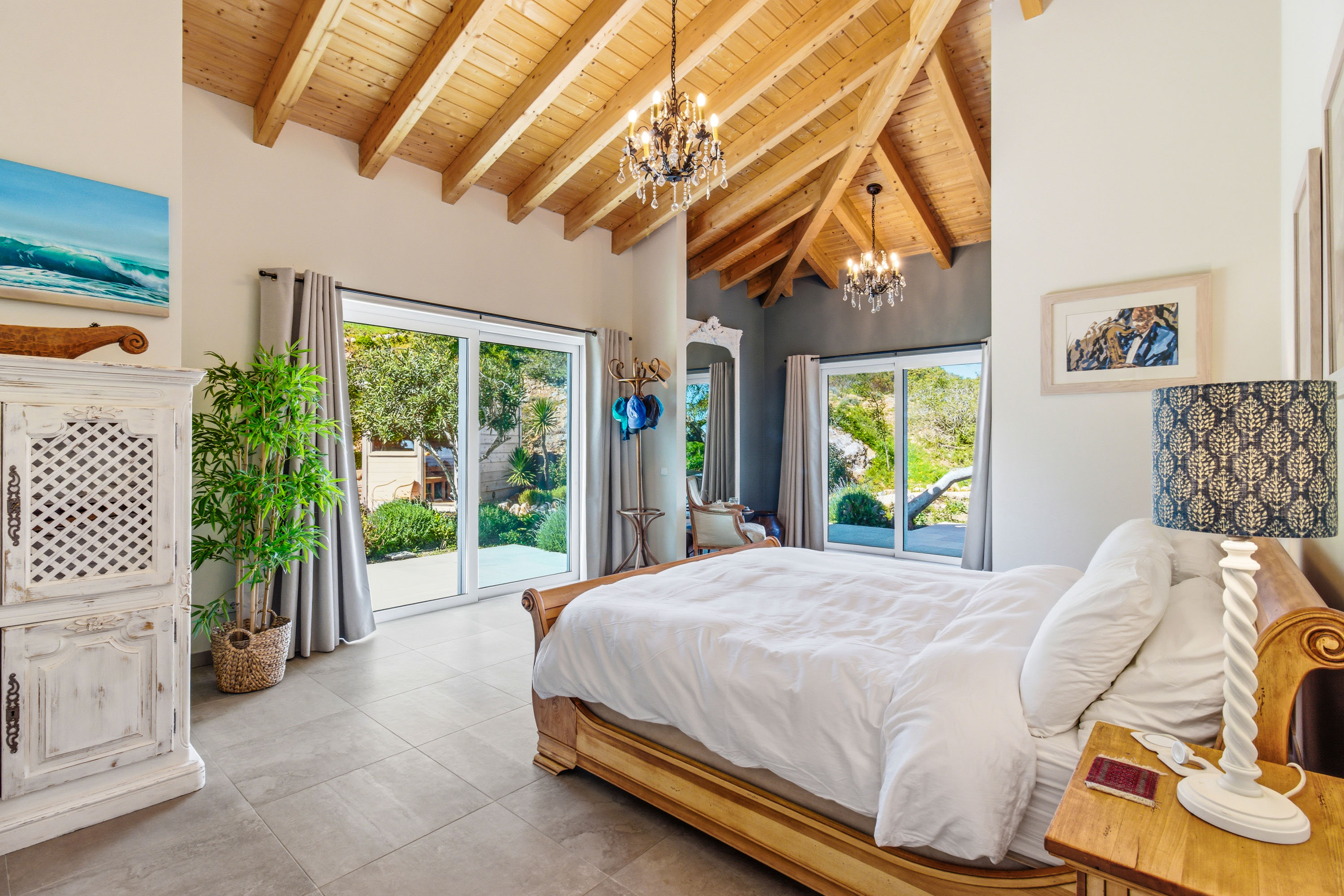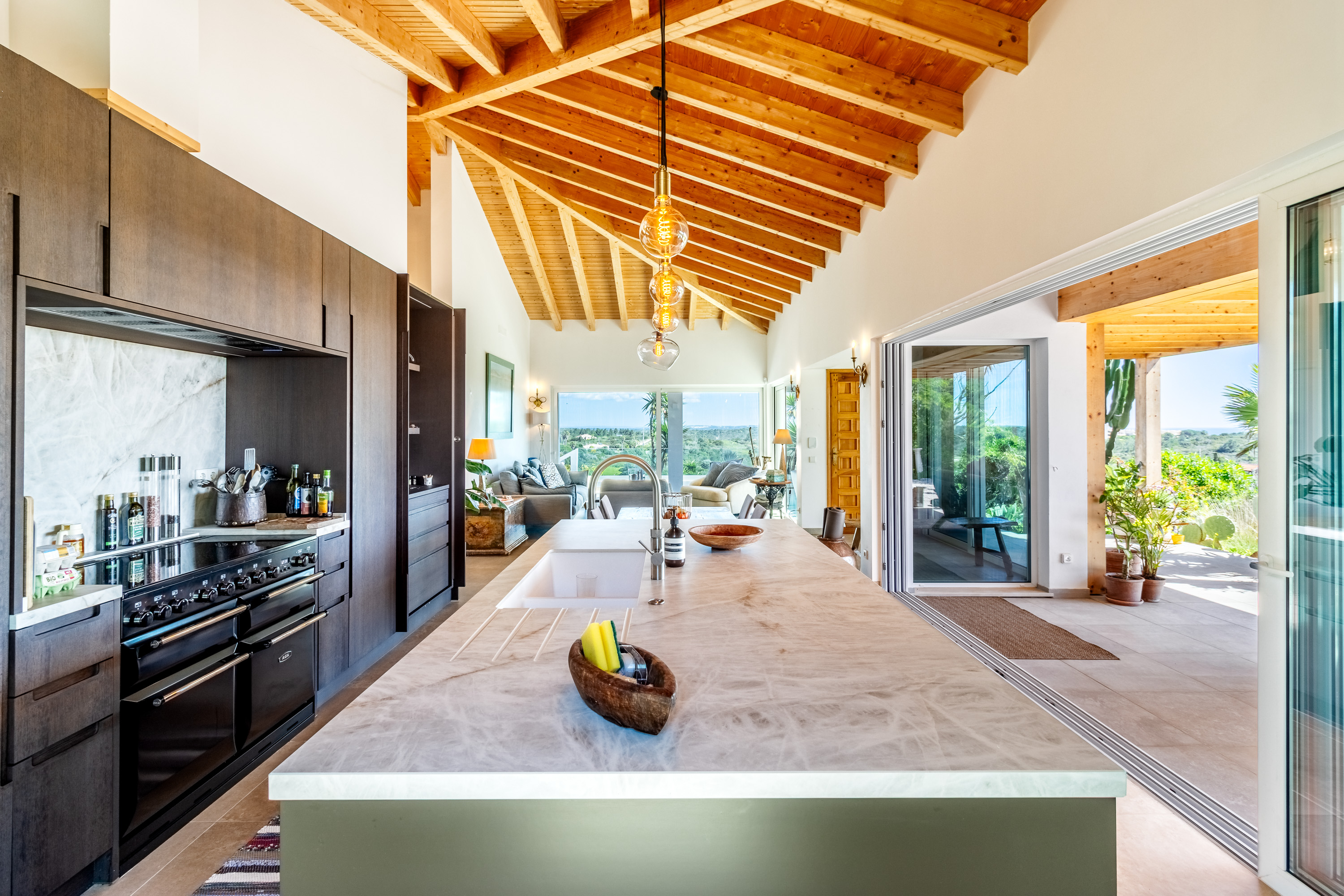 At the heart of the home lies a spectacular open-plan living space, where expansive sliding doors frame uninterrupted views of the countryside and out to the ocean and flood the interior with natural light. The seamless flow between indoor and outdoor living is perfectly complemented by the beautifully designed contemporary kitchen, which opens effortlessly into the dining area and extends onto a generous terrace, ideal for entertaining or simply enjoying the peaceful setting. This entire space is crowned by striking high wooden ceilings, adding both volume and character, while a stylish guest bathroom completes this level.