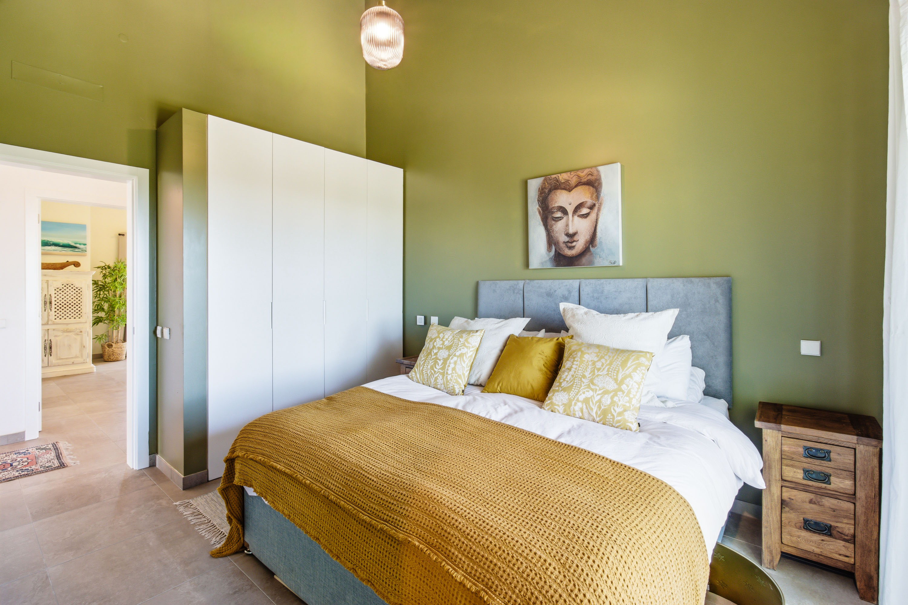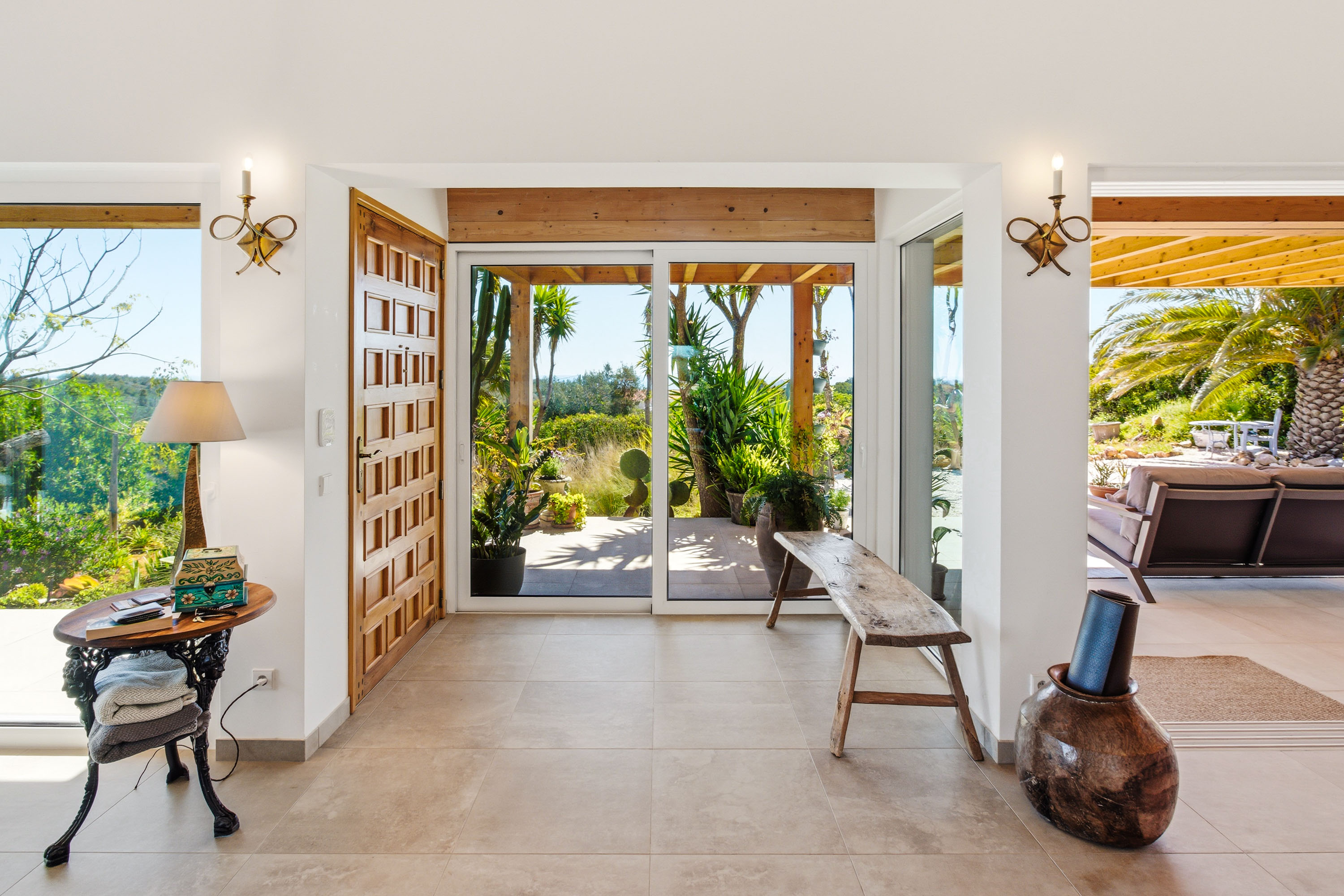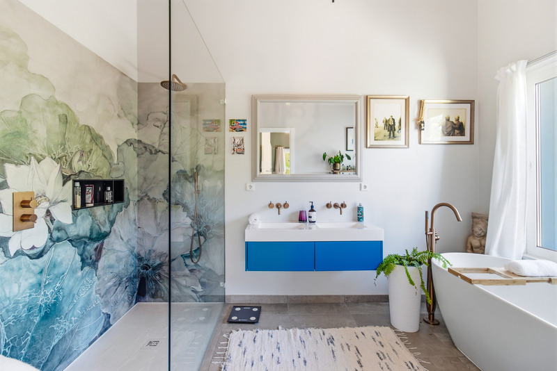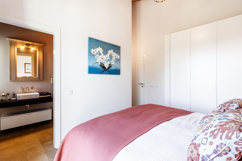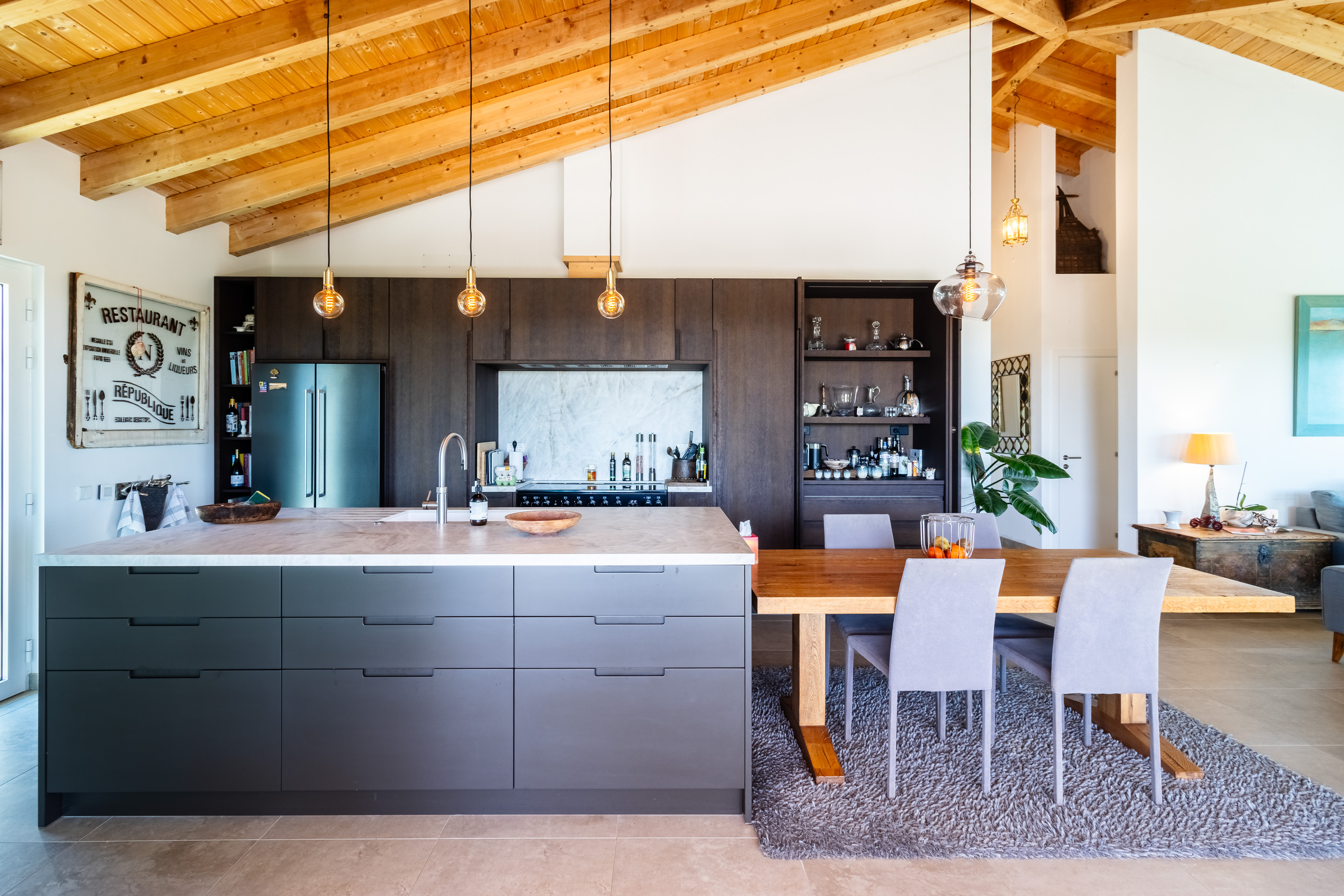 At the heart of the home lies a spectacular open-plan living space, where expansive sliding doors frame uninterrupted views of the countryside and out to the ocean and flood the interior with natural light. The seamless flow between indoor and outdoor living is perfectly complemented by the beautifully designed contemporary kitchen, which opens effortlessly into the dining area and extends onto a generous terrace, ideal for entertaining or simply enjoying the peaceful setting. This entire space is crowned by striking high wooden ceilings, adding both volume and character, while a stylish guest bathroom completes this level.