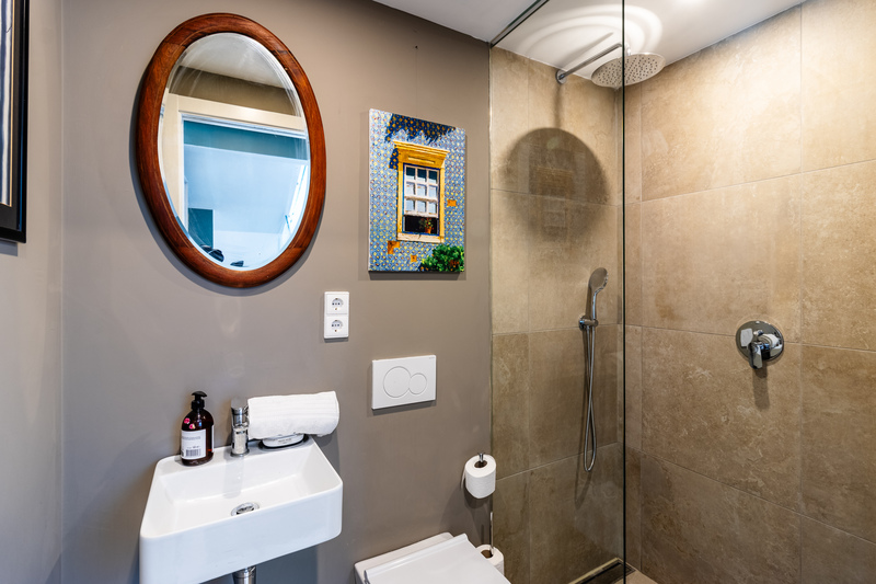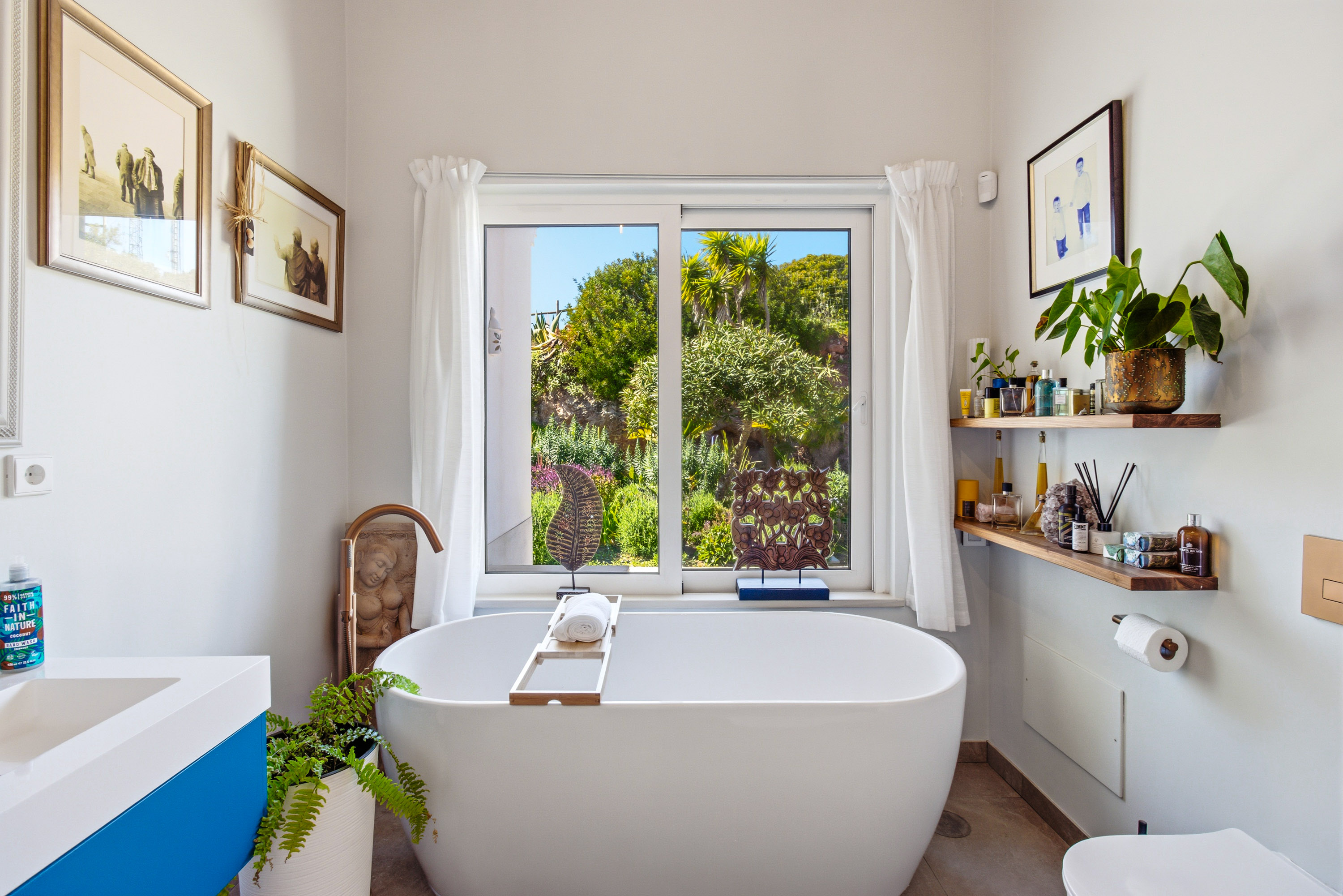 Continuing through the home, the elegant wood detailing guides you toward the bedroom quarters. The master suite offers a cosy yet refined retreat, featuring vaulted ceilings and direct access to the outdoors. The luxurious en-suite bathroom is designed for indulgence, with double sinks, a statement freestanding bathtub, and a walk-in shower with a distinctive design wall. Two additional bedrooms are equally spacious and beautifully appointed, each with its own uniquely designed en-suite bathroom, providing comfort and privacy for family or guests.