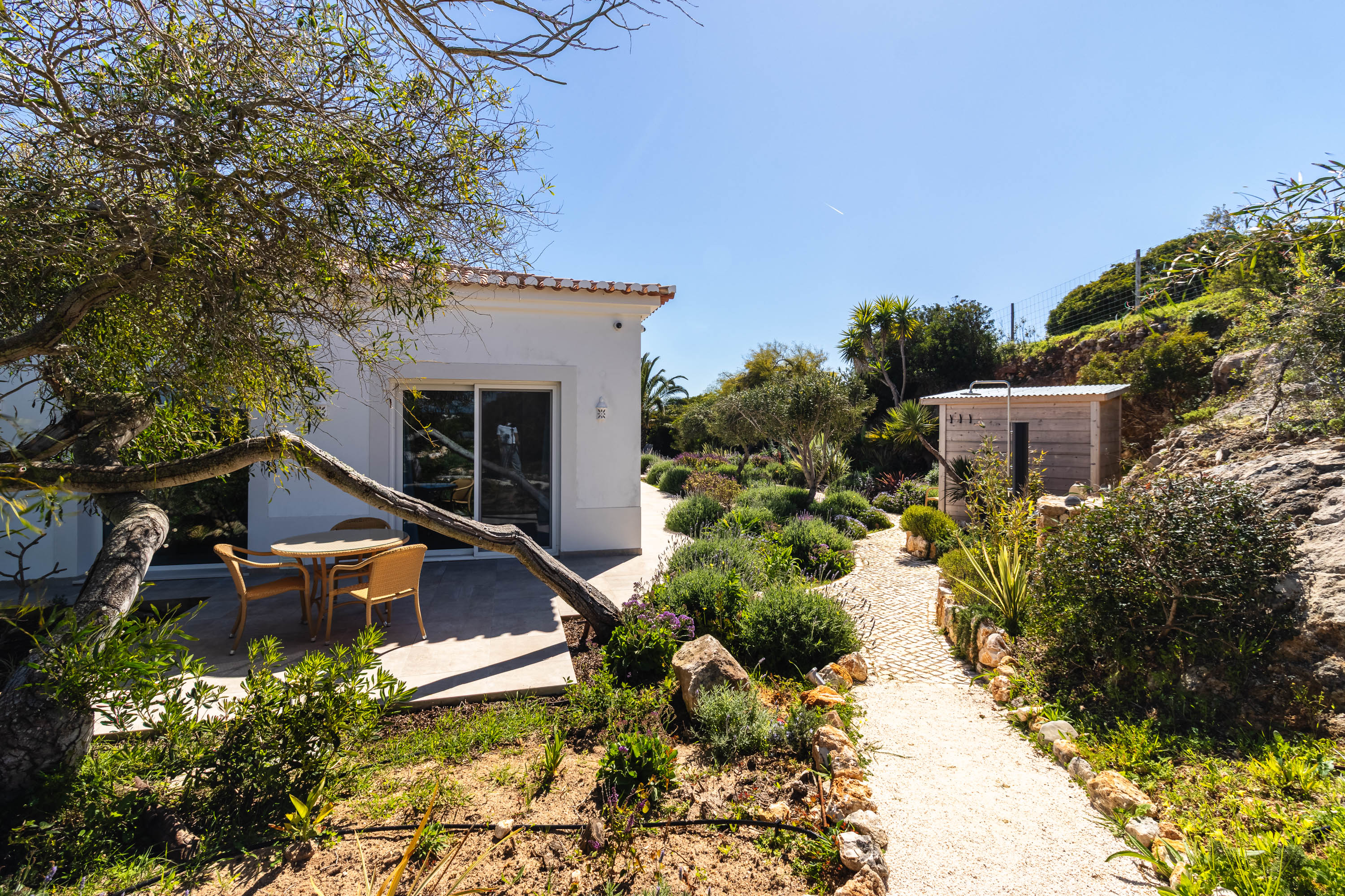 Outside, the property truly comes into its own, with expansive terraces designed for both relaxation and entertaining. From al fresco dining areas to peaceful zen-inspired gardens, every corner invites you to unwind while taking in the sweeping sea views and picturesque countryside surroundings. Adding to the sense of luxury, a sauna with sea views and an outdoor shower create a private wellness retreat, while a convenient carport completes the offering.