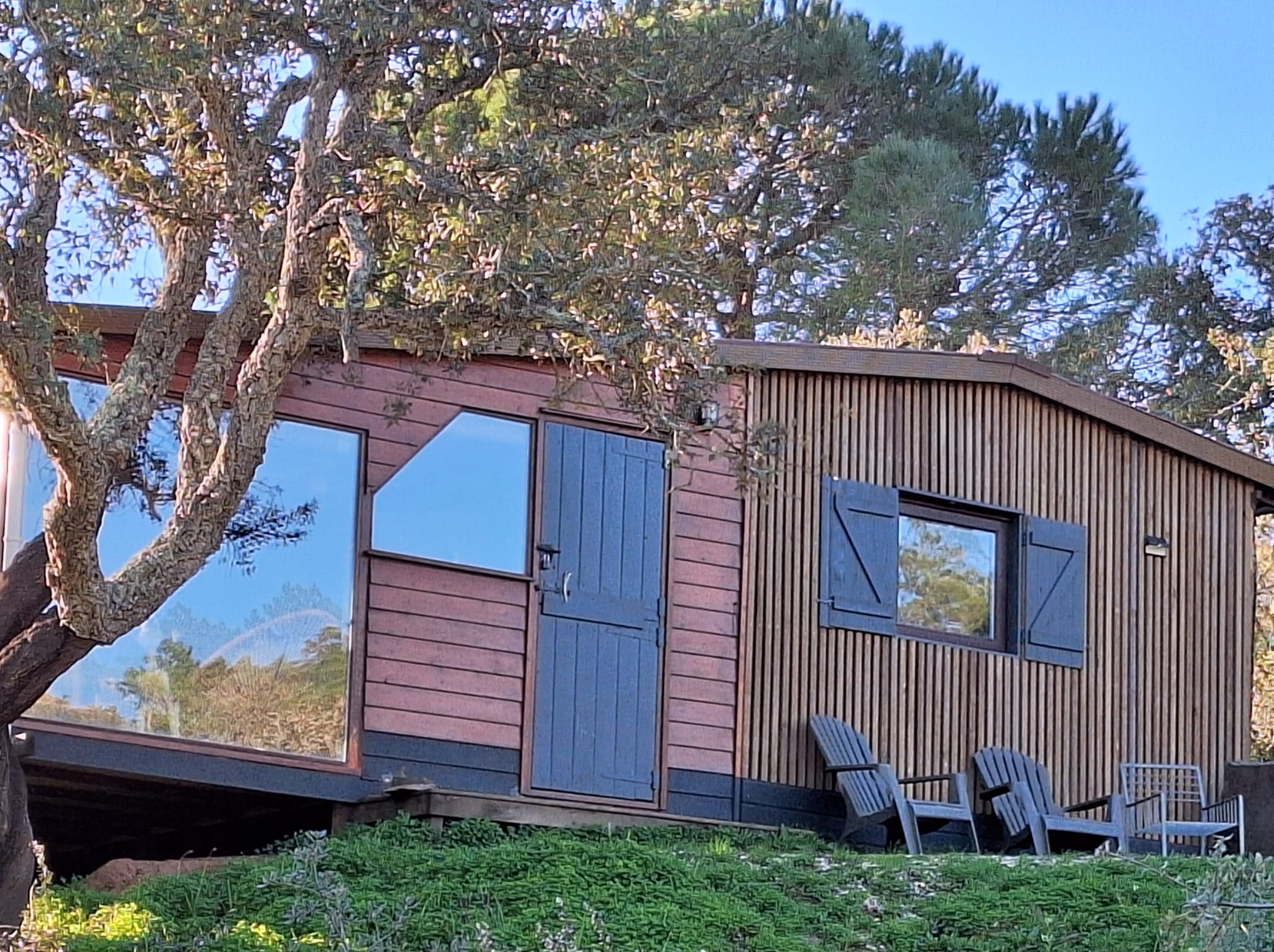 Also set within the landscape is a second dwelling, designed in a treehouse-style, and perfectly blended into nature. It includes two bedrooms, a kitchen, and a living space, each with stunning views. Mains water and electricity are connected here as well.