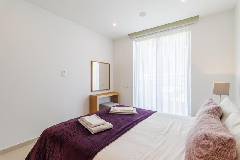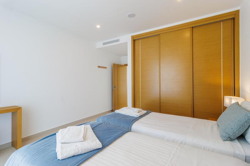 Les trois chambres sont spacieuses et doubles, la chambre principale bénéficiant de sa propre salle de bains attenante. Chaque chambre dispose d’un accès direct à un deuxième grand balcon, tandis qu’une élégante salle de bains familiale dessert le reste de l’appartement.