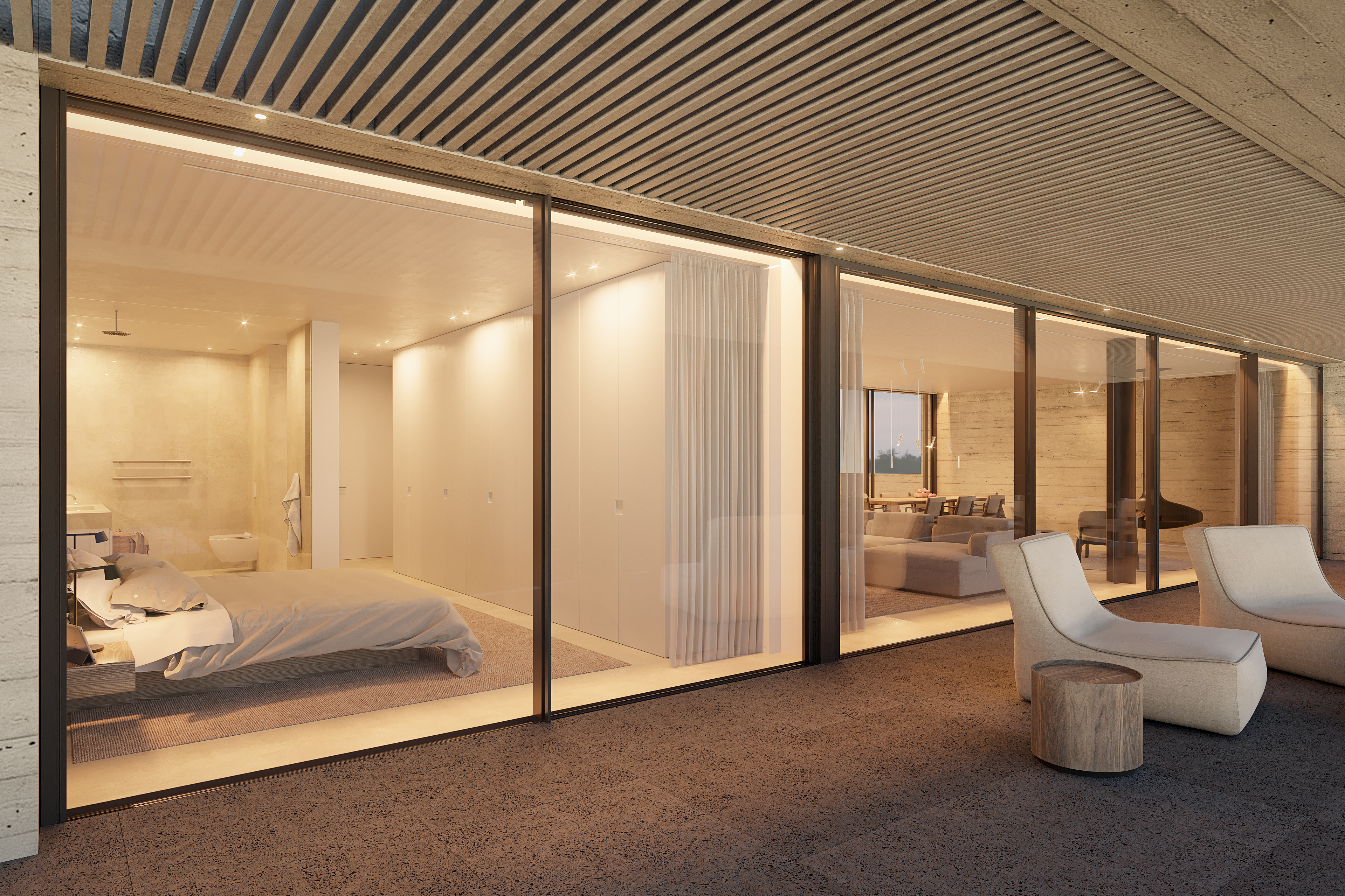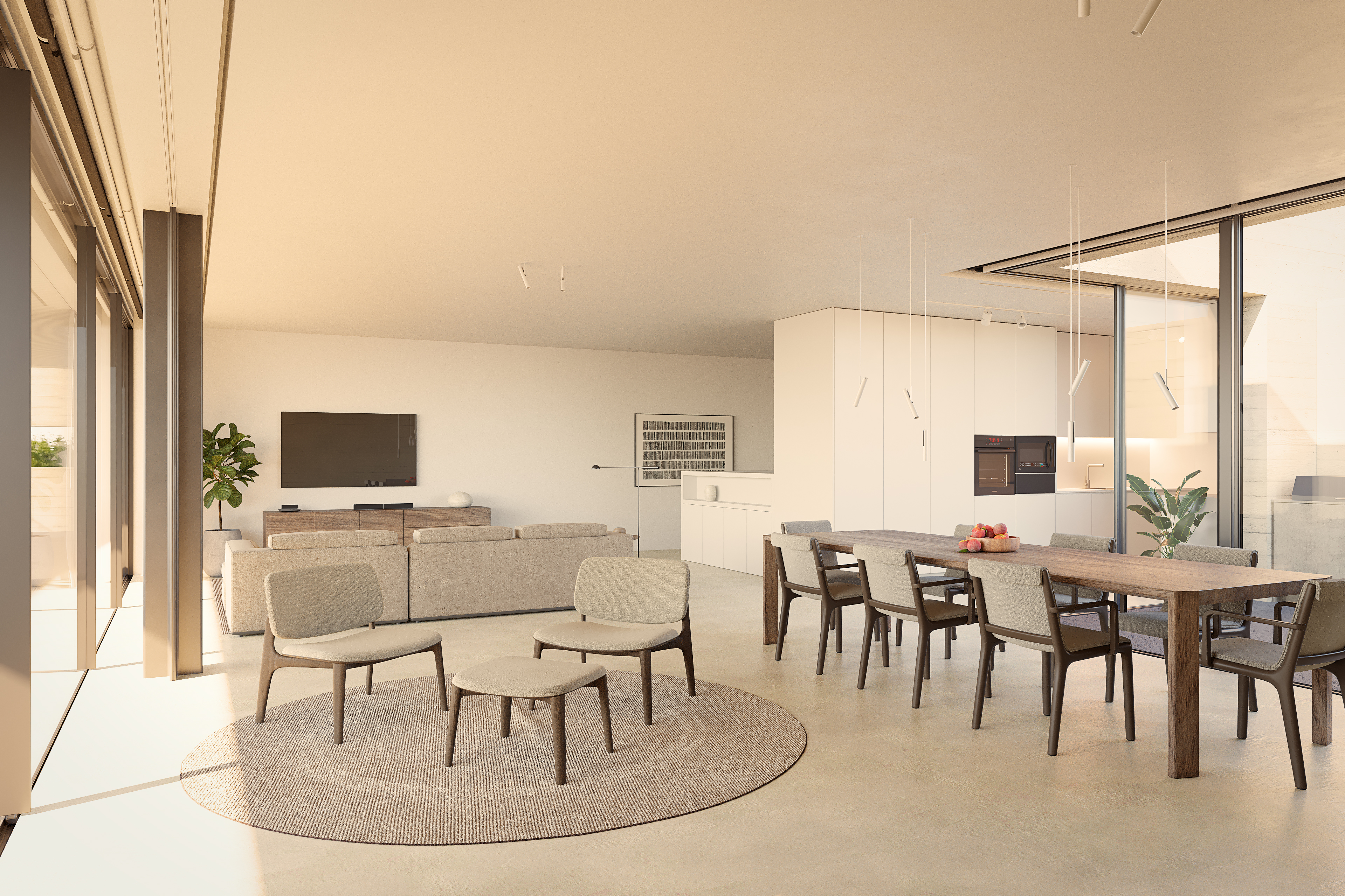 O primeiro andar é composto por uma suíte master com casa de banho privativa, uma cozinha/sala de jantar espaçosa e luminosa em plano aberto e a sala de estar, com portas de correr que se abrem para o grande terraço virado a sul, com uma fabulosa vista para o mar e para a piscina e jardim.