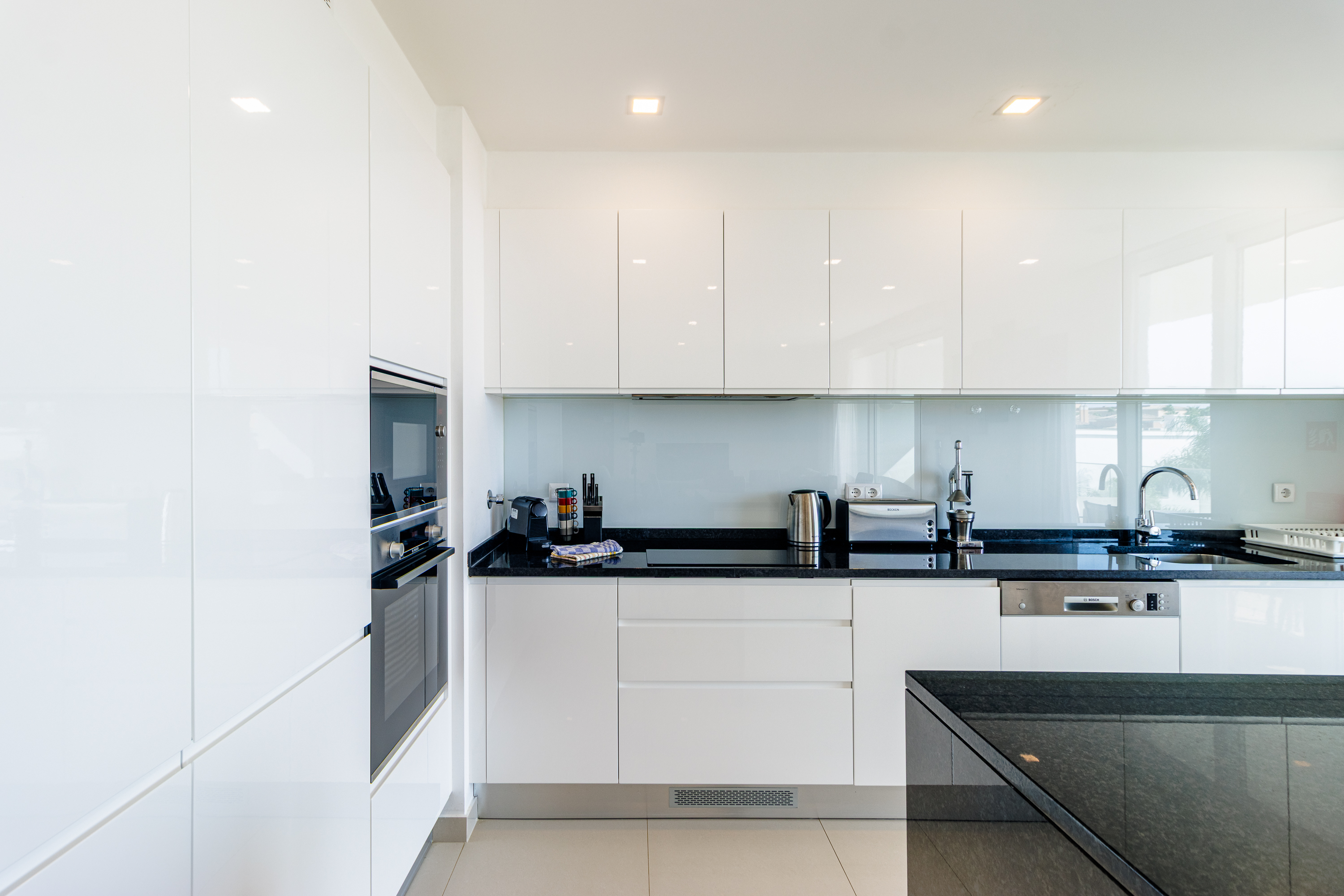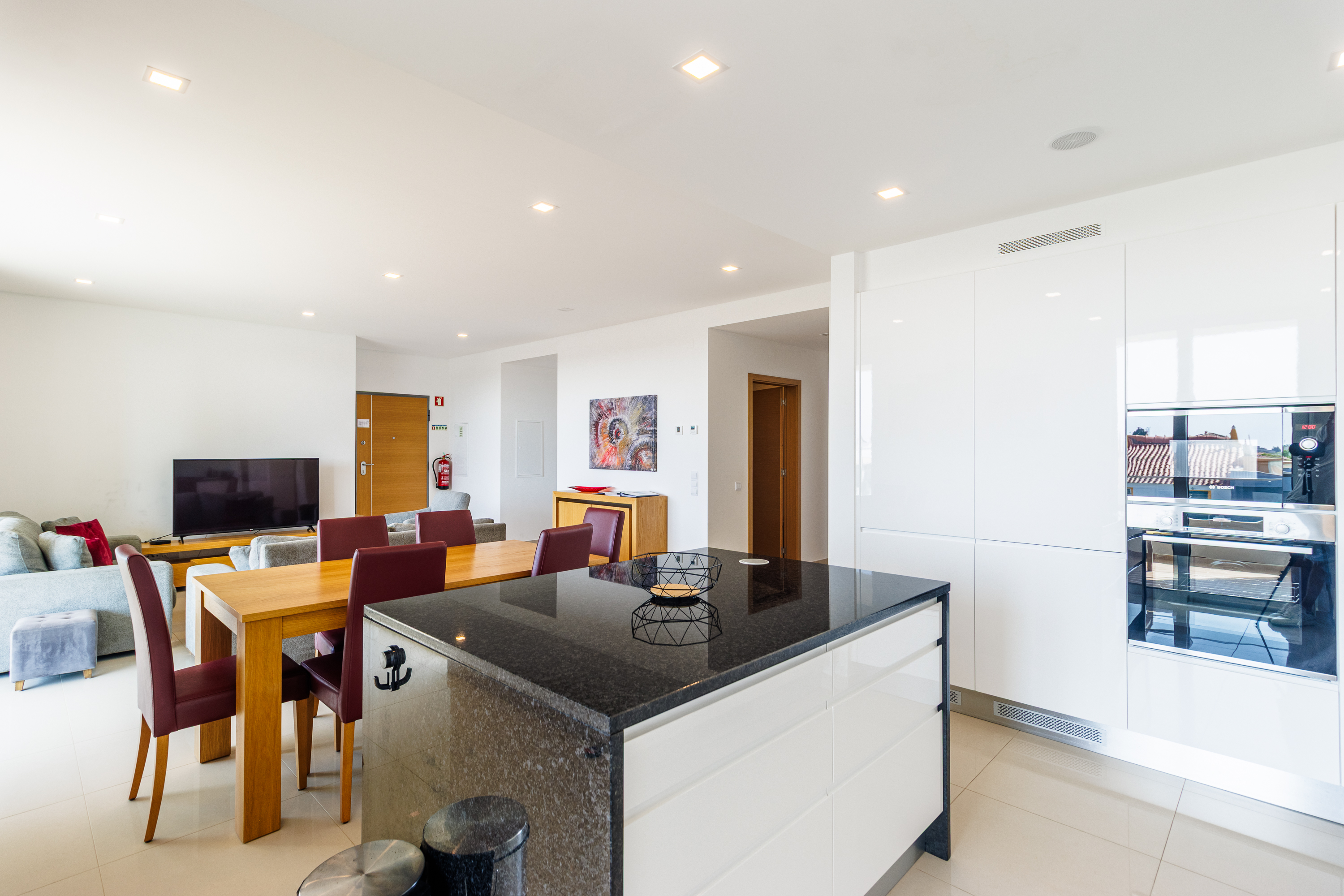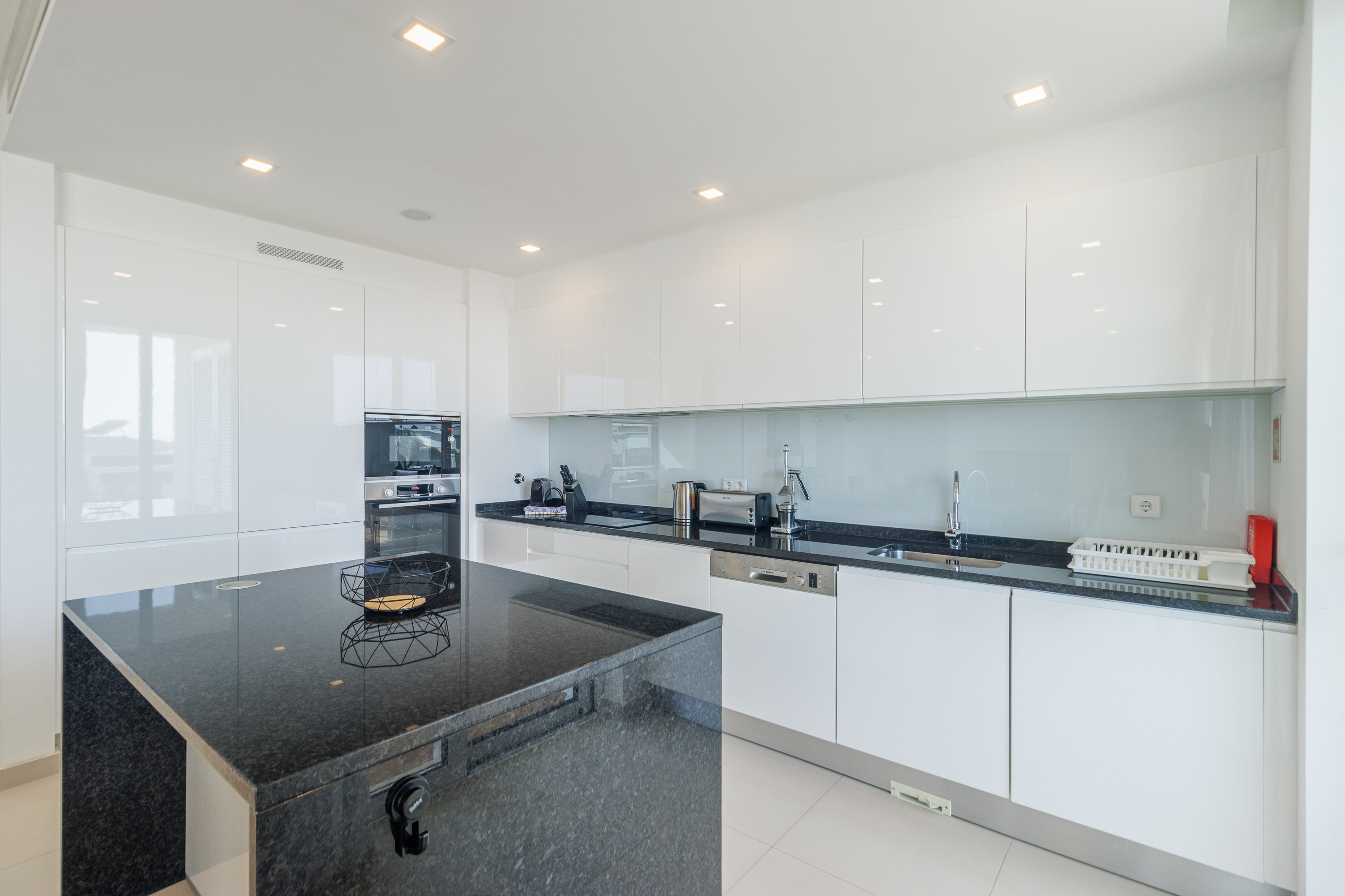 Lägenheten är inredd med exceptionell standard och har en ljus öppen planlösning som smidigt förbinder kök, matplats och vardagsrum. De flyter ut på en rymlig balkong som är idealisk för uteservering och avkoppling. Det moderna köket är fullt utrustat med Bosch-vitvaror, bänkskivor i granit och en central köksö – perfekt för både matlagning och umgänge.