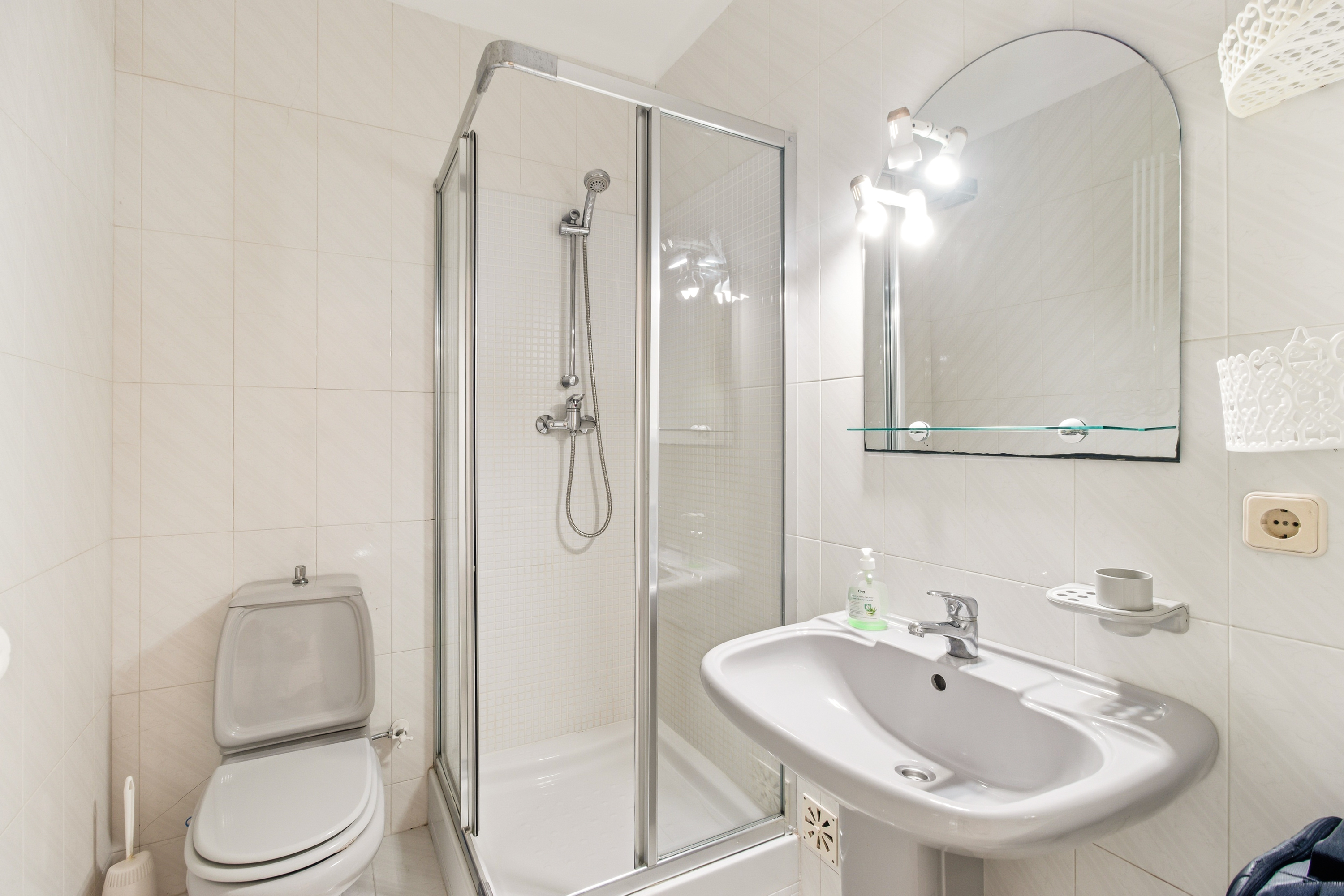 Lägenheten ligger högst upp i byggnaden (ingen hiss) och öppnas mot en rymlig hall som leder till ett ljust vardagsrum och matsal i öppen planlösning. Det angränsande, fullt utrustade köket har direkt tillgång till en terrass, medan vardagsrummet och båda sovrummen vetter mot en stor terrass i söder- och västerläge – perfekt för solbad, måltider utomhus eller för att njuta av havsbrisen.