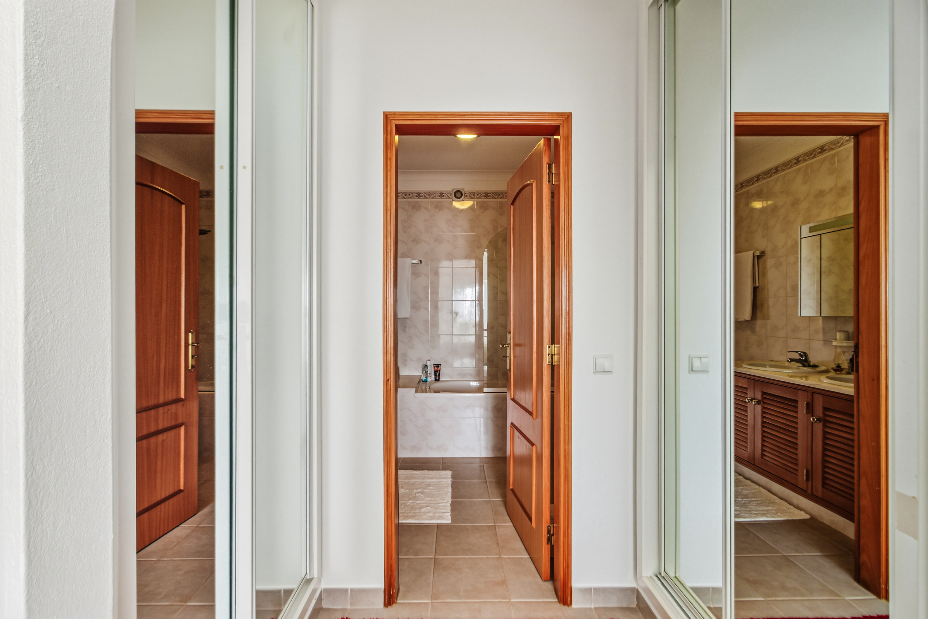 På nedre plan finns två rymliga dubbelrum med inbyggda garderober. Master bedroom har eget badrum och båda rummen har direkt utgång till en generös terrass och privat trädgård, perfekt för avkoppling eller måltider utomhus. Det andra sovrummet har tillgång till ett stort familjebadrum.